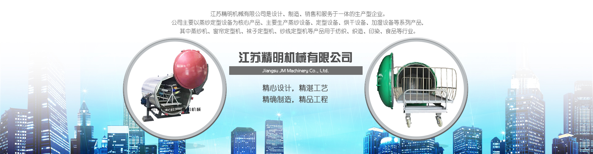 江蘇精明機械有限公司是設計、制造、銷售和服務于一體的生產型企業。公司主要以蒸紗定型設備為核心產品、主要生產蒸紗設備、定型設備、烘干設備、加濕設備等系列產品,其中蒸紗機、窗簾定型機、襪子定型機、紗線定型機等產品用于紡織、織造、印染、食品等行業。主要經營包括:1、蒸紗設備:蒸紗機、蒸紗箱、蒸紗缸、蒸紗鍋、蒸紗小樣機等2、定型設備:窗簾定型機、襪子定型機、圍巾定型機、手套定型機、紗線定型機、低彈絲定型機、丙綸絲定型機等3、烘干設備:布料烘干機、拉幅烘干機、染整烘干機等4、加濕設備:棉紗加濕機、氣流紡...